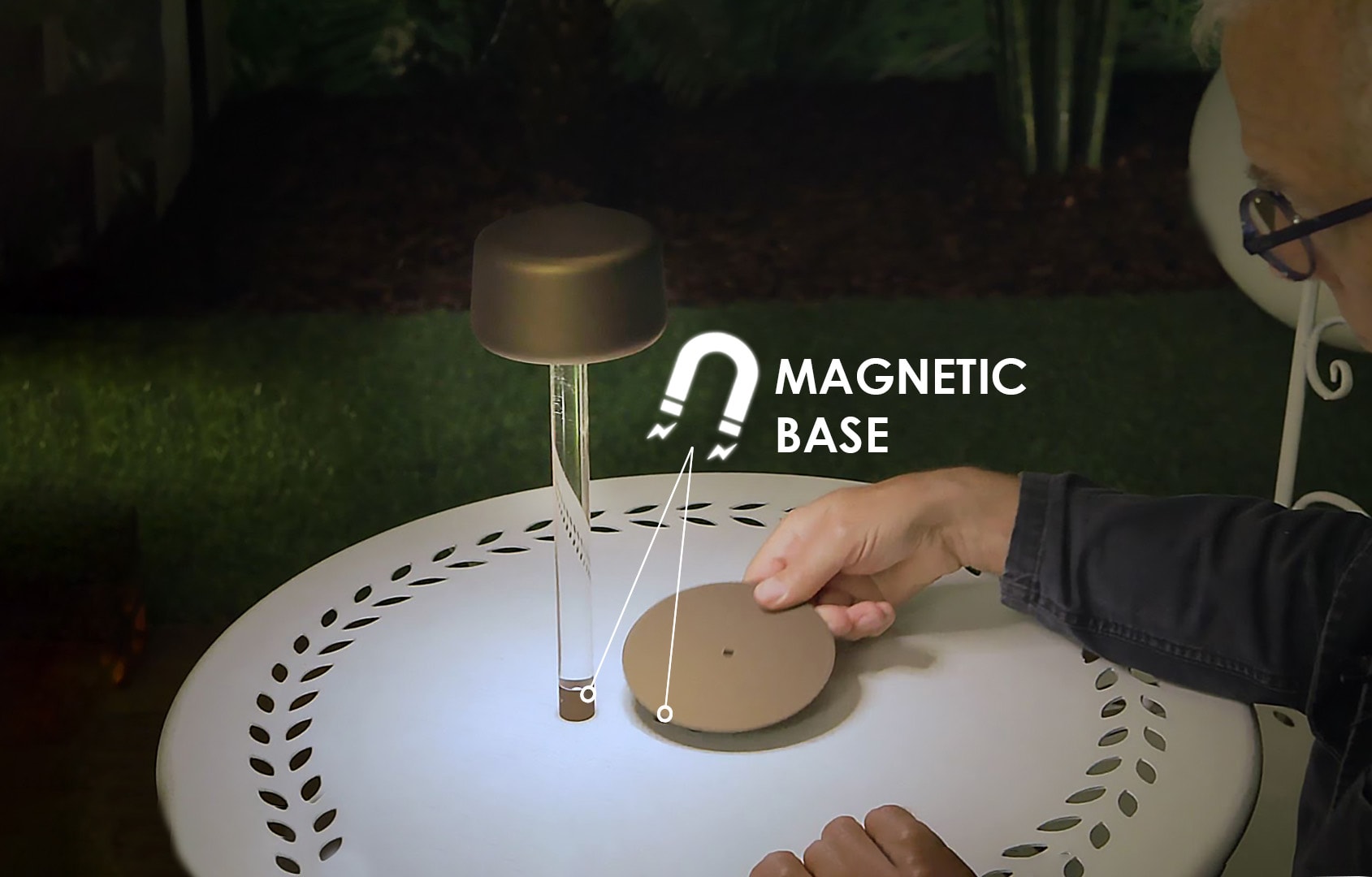 The round base is magnetic and ensures the stability of the lamp even when it’s placed under a surface, such as a tablecloth.