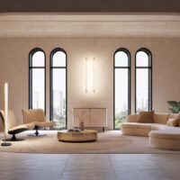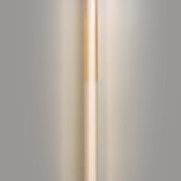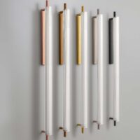 La lampada a parete è un connubio di vetro e metallo, un’unione di parti slanciate.