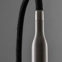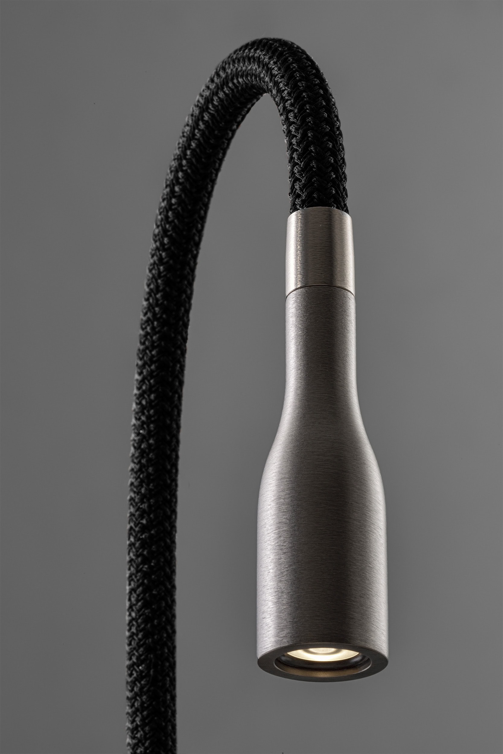 Il braccio snodabile è rivestito in tessuto a treccia marrone con trama in rilievo.